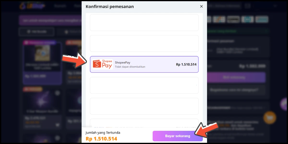 Pilih ShopeePay sebagai metode pembayaran, lalu klik tombol Bayar Sekarang.