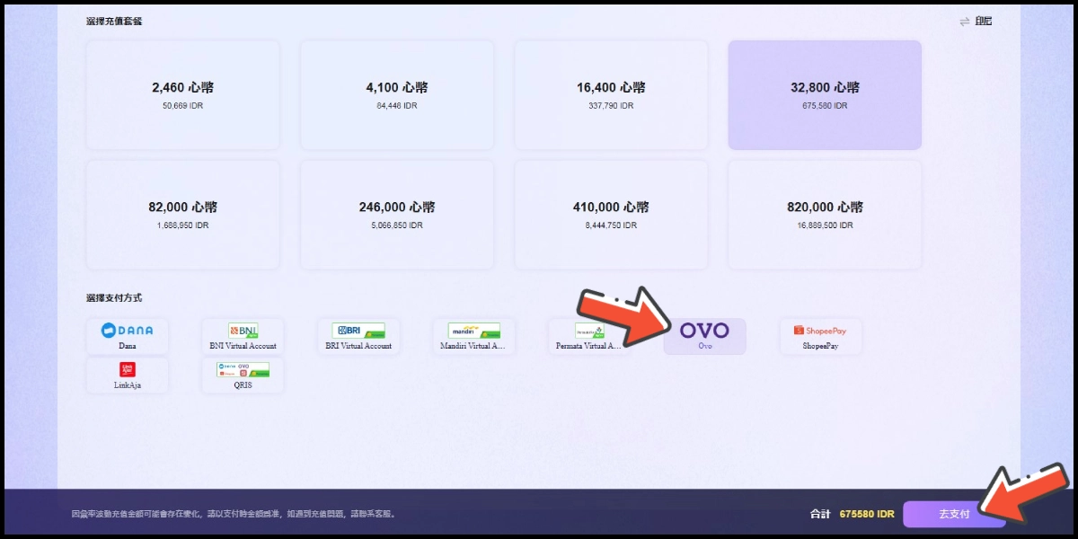 Pilih item yang ingin Anda beli, pilih OVO sebagai metode pembayaran, lalu klik tombol 去支付 (Bayar). (Instruksi ini menggunakan E-wallet OVO sebagai contoh)