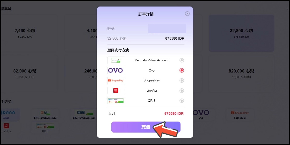 Konfirmasi informasi dan metode top up Anda, lalu klik tombol 充值 (top up).