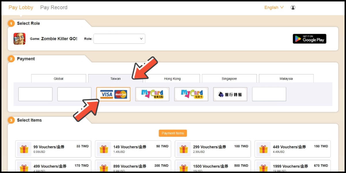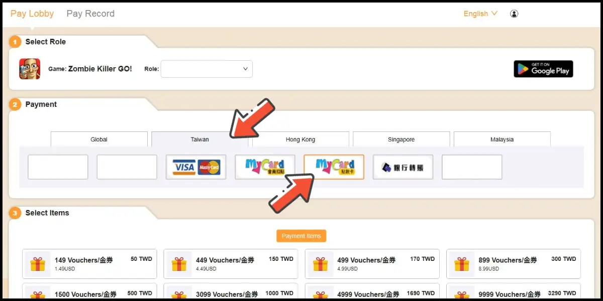 Pilih Taiwan sebagai wilayah pembayaran, lalu pilih MyCard點數卡 (Voucher MyCard) sebagai metode pembayaran.