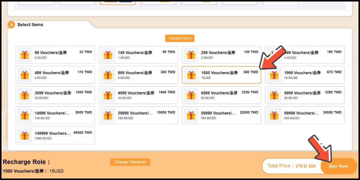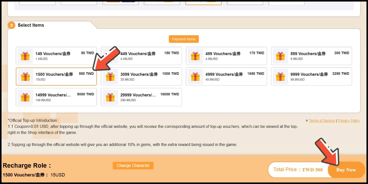 Pilih item yang ingin Anda top up, lalu klik tombol Buy Now.