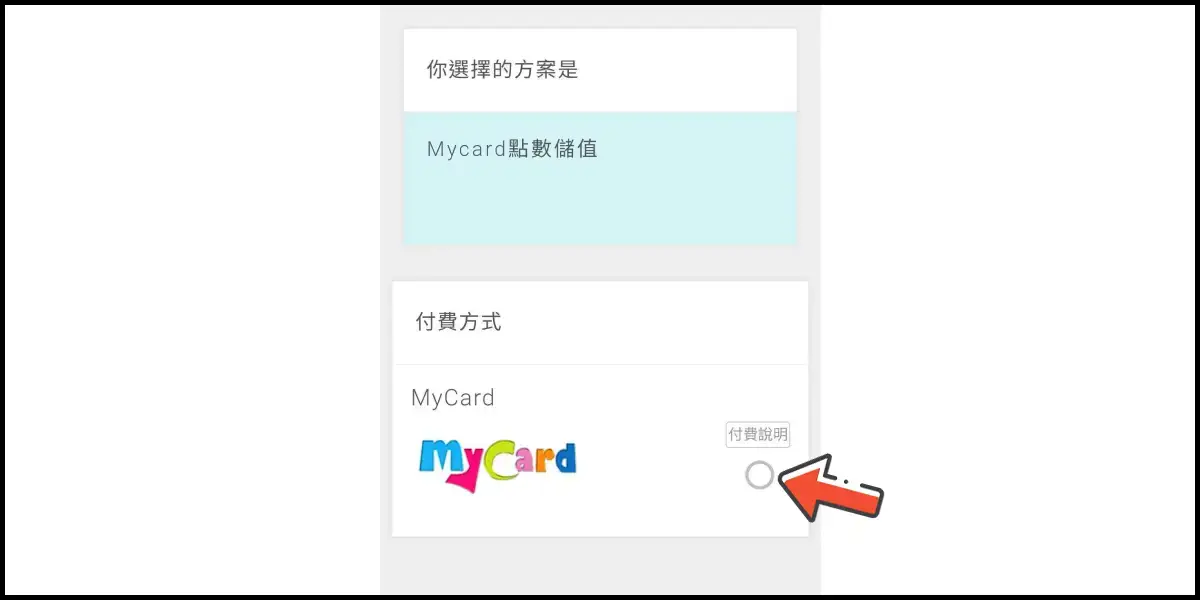 點擊勾選 MyCard 付費說明下方的圓圈選項。