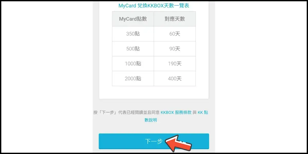 確認 MyCard 點數對應的 KKBOX 天數,閱讀並同意服務條款後,點選「下一步」。