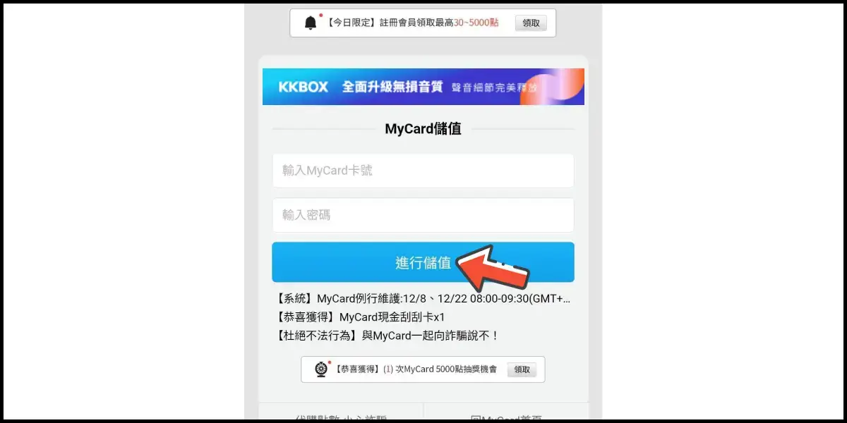 輸入 MyCard 卡號及密碼,點選「進行儲值」,即可完成。
