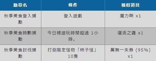 為了紀念本次活動,遊戲還將同步舉辦每日勳章活動。只要達成「登入遊戲」、「遊玩時數」與「討伐柿子怪數量」等不同條件,就能獲得能夠以全滿 HP 及 MP 狀態復活的「復活之露」等有用冒險道具獎勵。