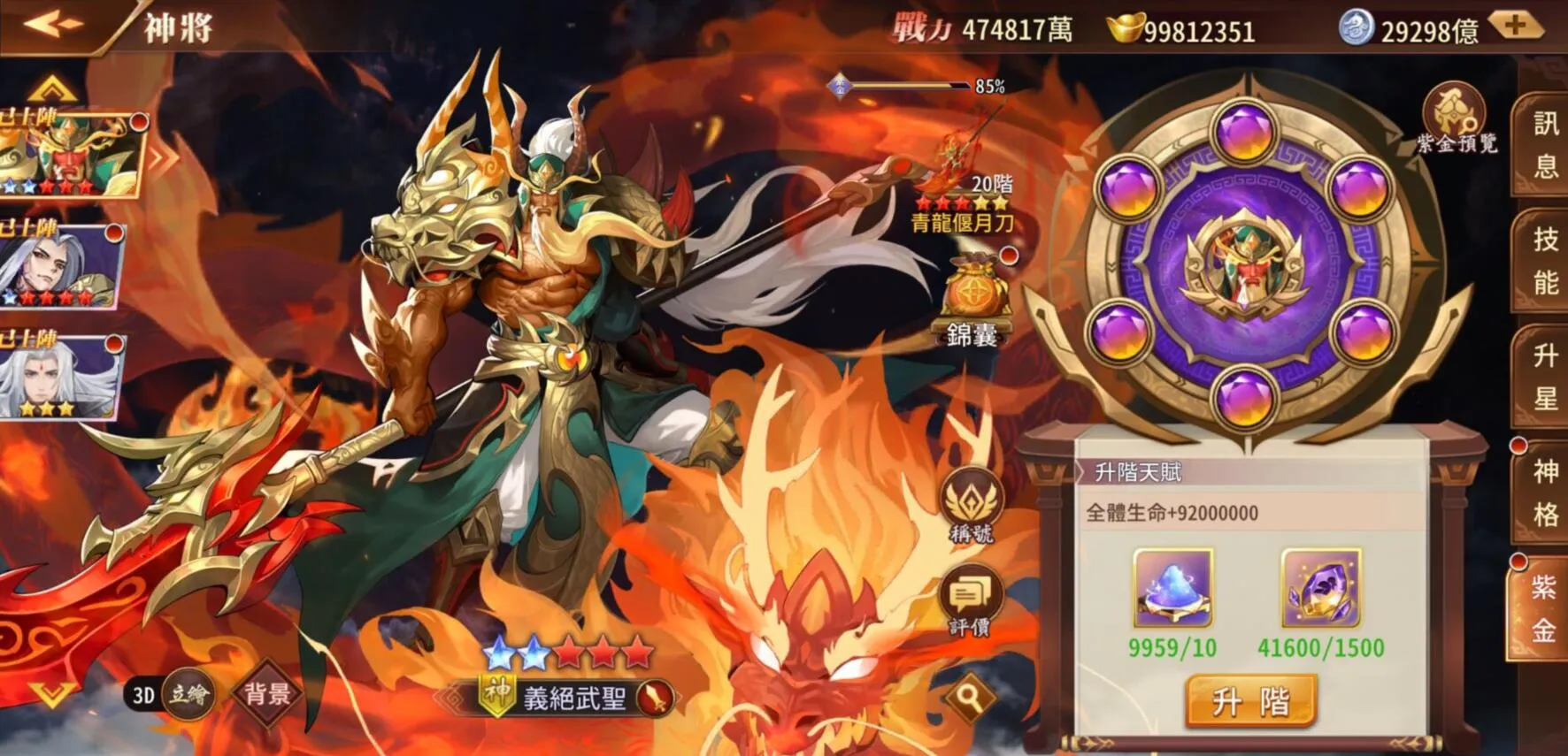 神將晉升紫金將獲得大量屬性加成與專屬的強絕紫金無雙技能