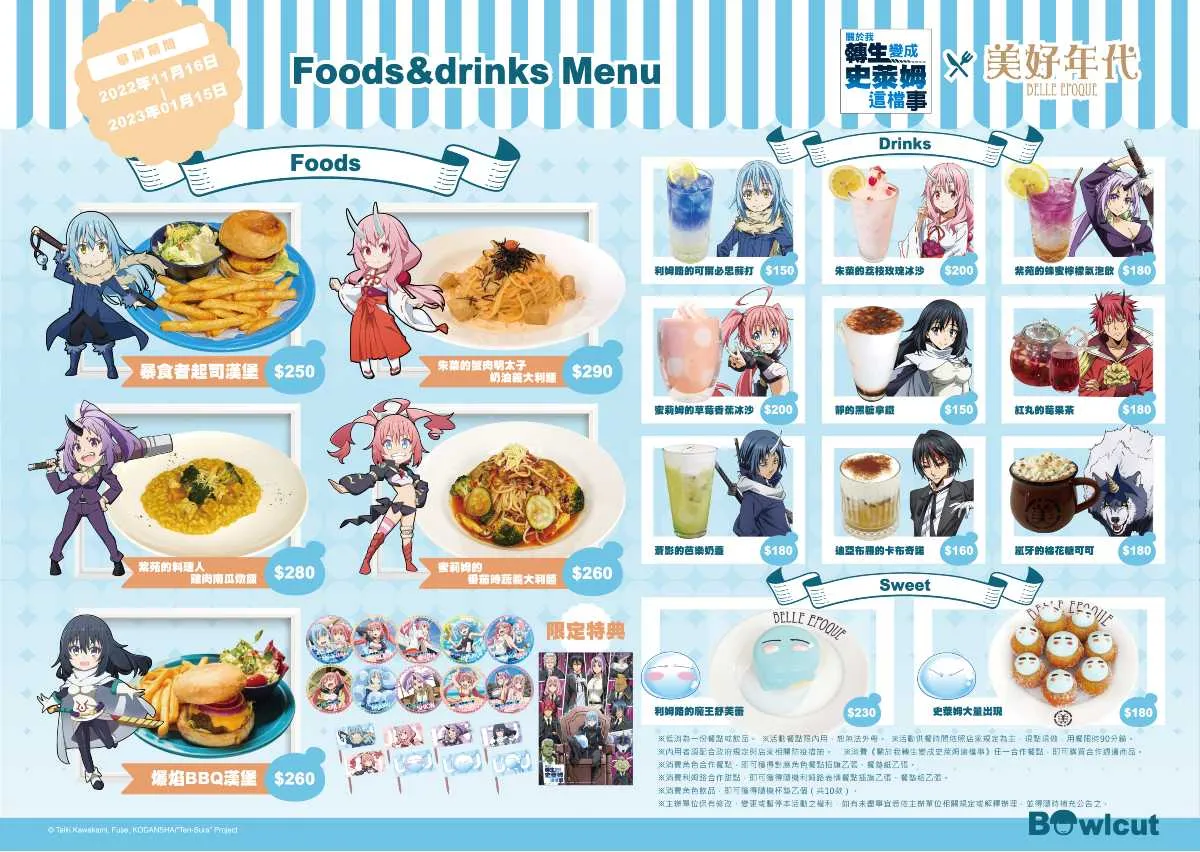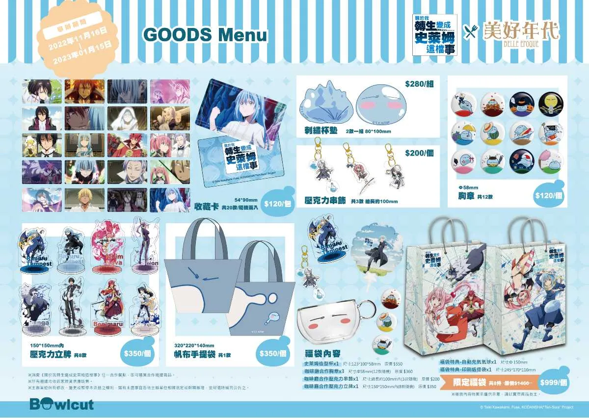 活動期間凡消費合作餐點,隨餐附贈精美餐墊、角色插旗;消費合作飲品即贈隨機角色杯墊。現場更可購買精美週邊,經典動畫場景收藏卡、利姆路刺繡杯墊、帆布手提袋等多樣獨家商品,本次主題Café推出超值限定福袋,內含超萌利姆路造型杯等8款精美週邊與福袋專屬特典,數量有限,售完為止!