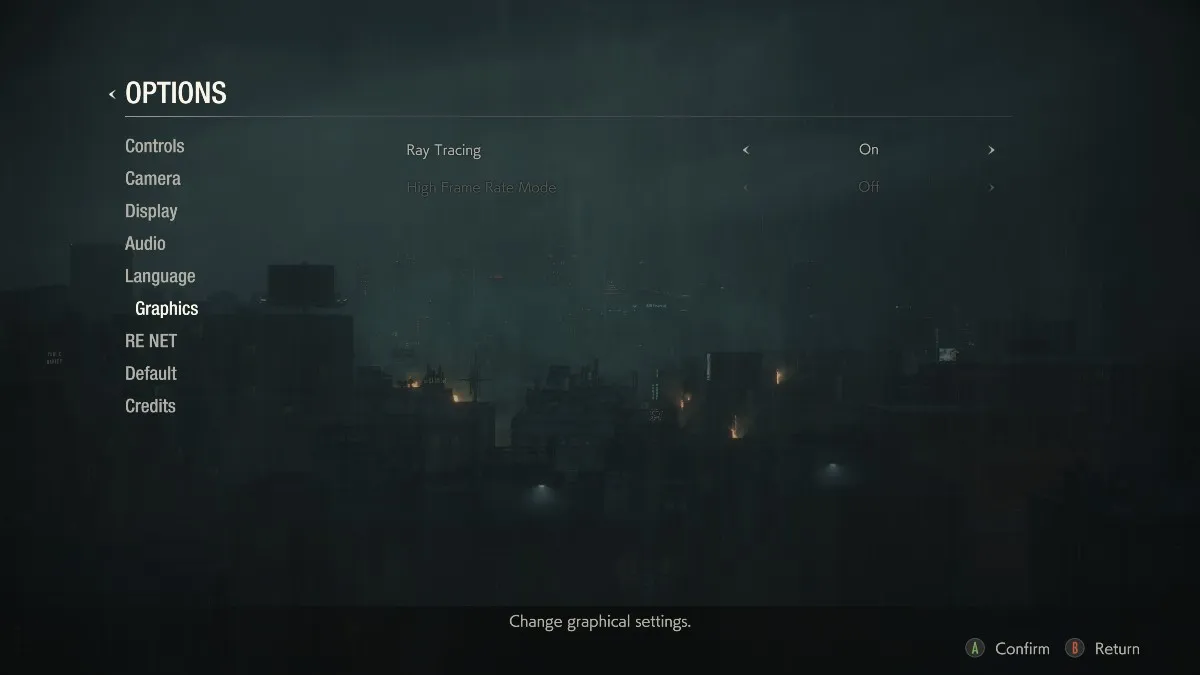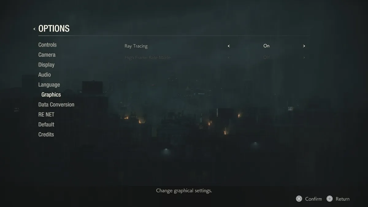 《Resident Evil 2》的選項畫面-光線跟蹤的 ON/OFF、高幀率的 ON/OFF 等均可根據遊玩環境和自己的喜好而變更。