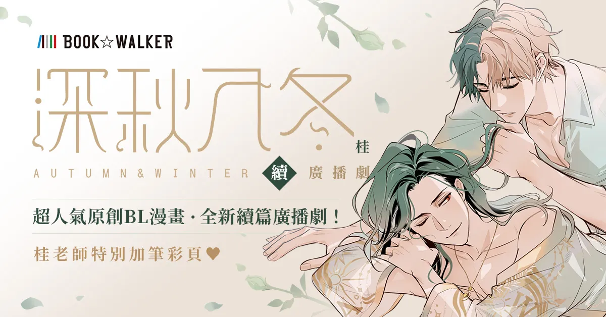 日本正版授權電子書平台BOOK✩WALKER將於5月7日獨家上架台灣知名漫畫家「桂」的人氣作品《深秋入冬》續集—《深秋入冬‧續》改編廣播劇,除了改編廣播劇是全新劇情外,作者更加筆繪製彩頁作為特典!桂老師曾繪製《家有黑貓魔法師》、《我的網紅男友》等暢銷作品,而最新作《深秋入冬》則描寫忠犬攻髮型設計師「藍秋」和女王受設計師「嚴冬」相遇相戀的故事,推出後就擄獲了許多腐腐的心,討論度居高不下,在BOOK✩WALKER購書還會贈送2款特製書架!