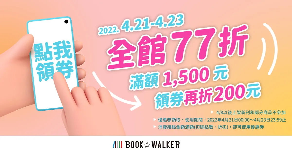 最寵讀者的BOOK✩WALKER也將在月底4月21日至4月23日舉行為期3天的全館77折活動,只要先領券、滿額1500元就再折200元!還可以搭配手上的點數再做折抵,點數1點就等於1元,消費不限金額都可以做折抵!而4月也來到了尾聲,已領取的活動優惠券也別放到過期,搭配全館活動使用更優惠!若是新註冊會員還有首購優惠,不限書種、不限金額、不限數量都有79折!快趁著全館優惠將願望清單一次清空吧!