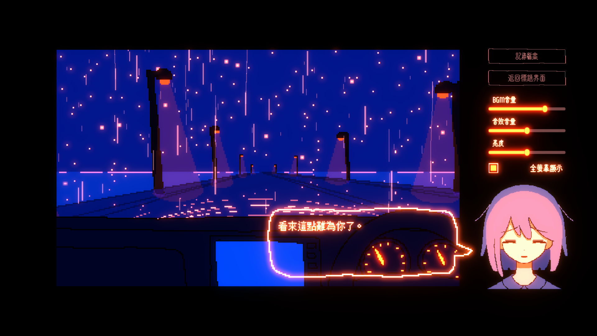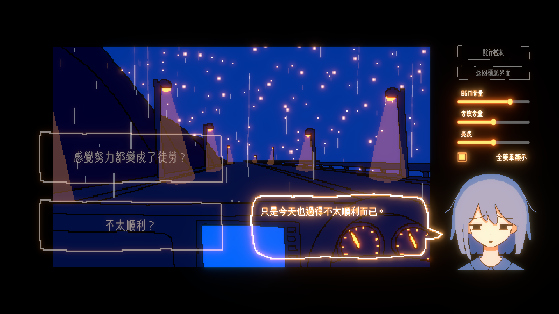 本作是一款透過選項讓故事分歧發展的對話型冒險遊戲。與一名帶著陰鬱氣質的少女交談時,請選擇屬於你自己的話語。在不知目的地的夜間旅途中,車內只有你與少女兩人。空間中瀰漫著安靜的雨聲,以及儀表板微弱的光與窗外的路燈。你所說出的每一句話,都將引導故事走向四種不同的結局。當看過所有結局之後,還將迎來另一個落幕……。究竟什麼才是對少女而言、對你而言正確的選擇?答案只存在於實際遊玩後的你的心中。