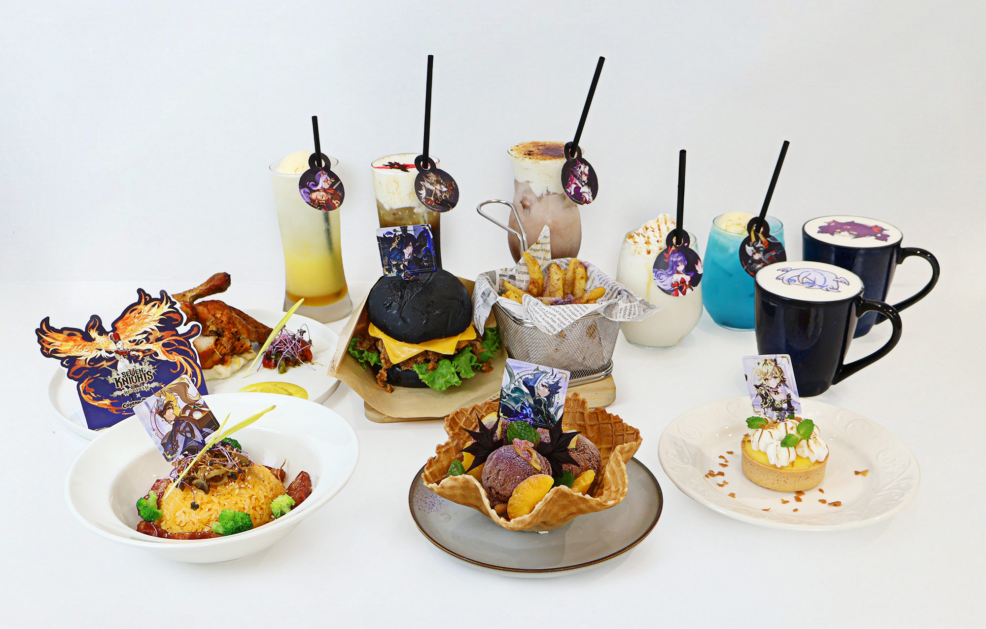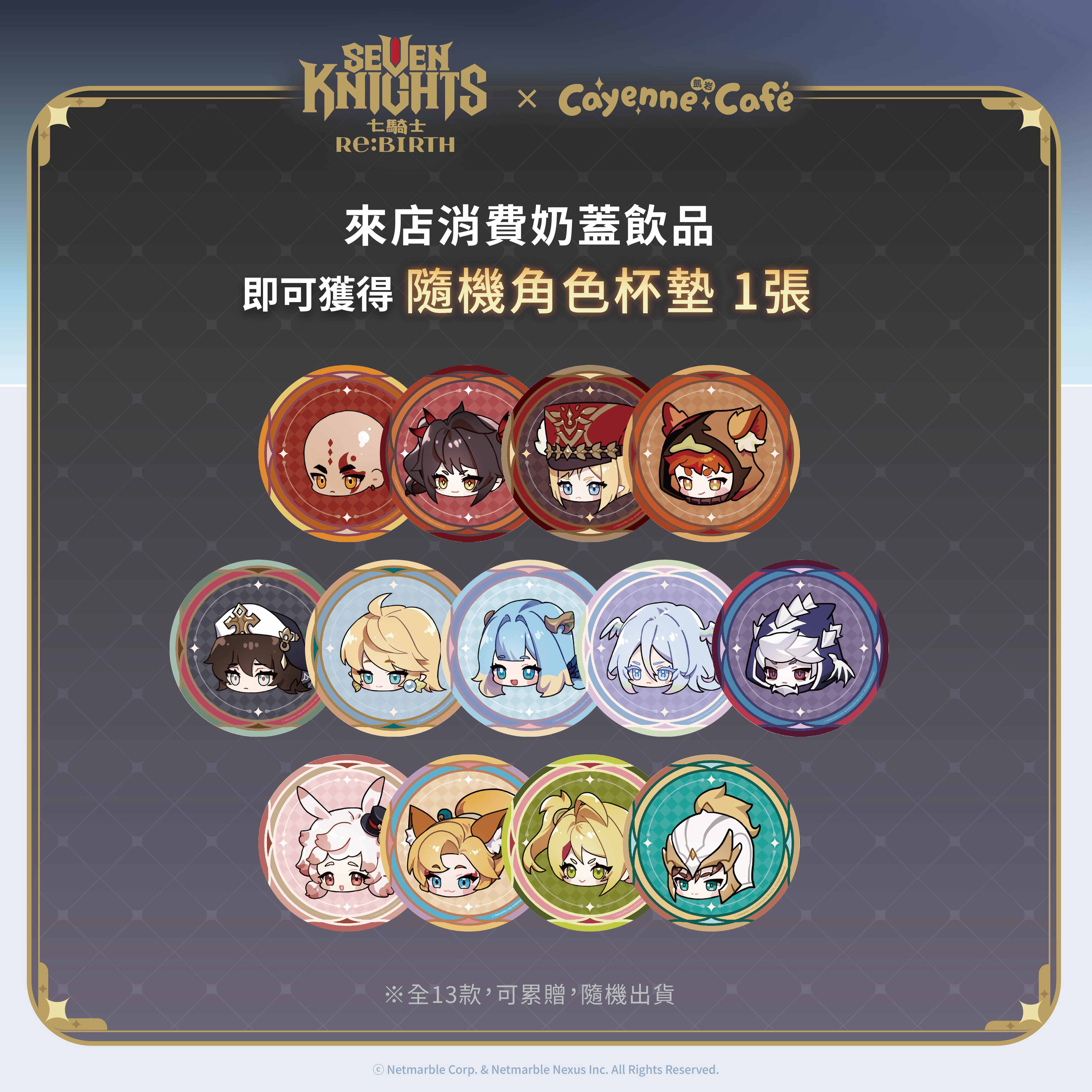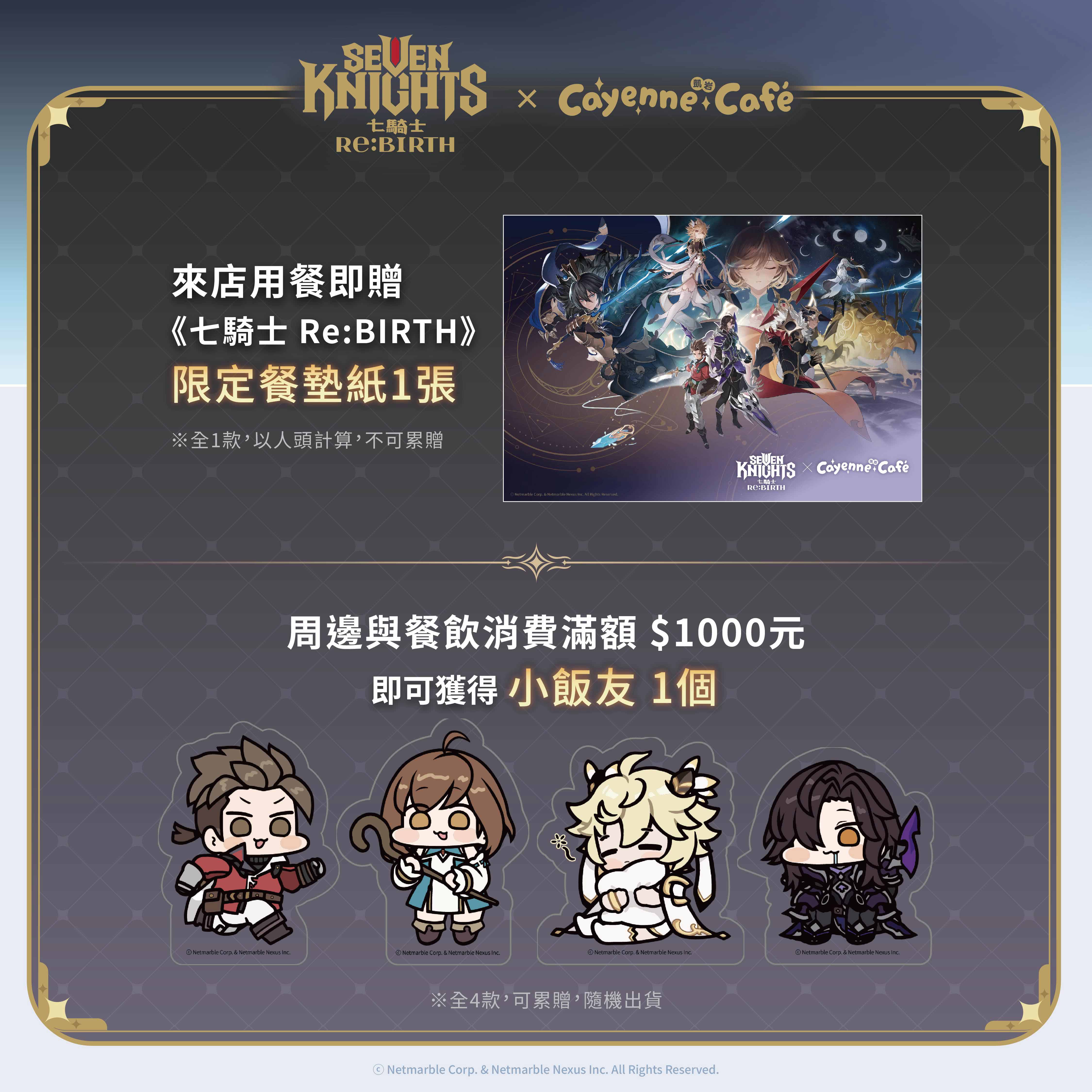 本次聯名合作更推出以遊戲英雄角色為主題的多款主餐、甜點與特調飲品,將英雄特色、技能轉化為創意料理,例如象徵路迪堅定信念的黃金炊飯,以及展現雷伊潔兒火焰之力的燒烤拼盤等,讓玩家在視覺與味覺上,都能感受到英雄角色的靈魂。凡於活動期間至咖啡廳消費,即有機會獲得《七騎士Re:BIRTH》Q版角色杯墊、角色精美小卡、主題吸管套等周邊好禮。