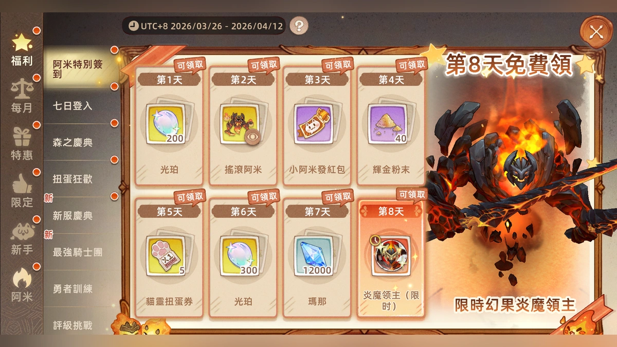 全新冒險服【阿米大冒險】開放,完成活動即可享受價值100,005的彩珀資源!扭蛋狂歡120連抽貓靈扭蛋券、森之慶典金色裝備8件套免費送,讓你從起步就快人一步。萌趣小阿米跟寵、金色時裝三件套、小阿米主題家具直接領,讓你全方位沈浸式感受養成小阿米的過程。簽到8天還可限時體驗新服最強紅色幻果阿米,阿米擁有多種高傷害技能,輕鬆秒殺對手,讓你體驗主宰戰場的終極爽感。