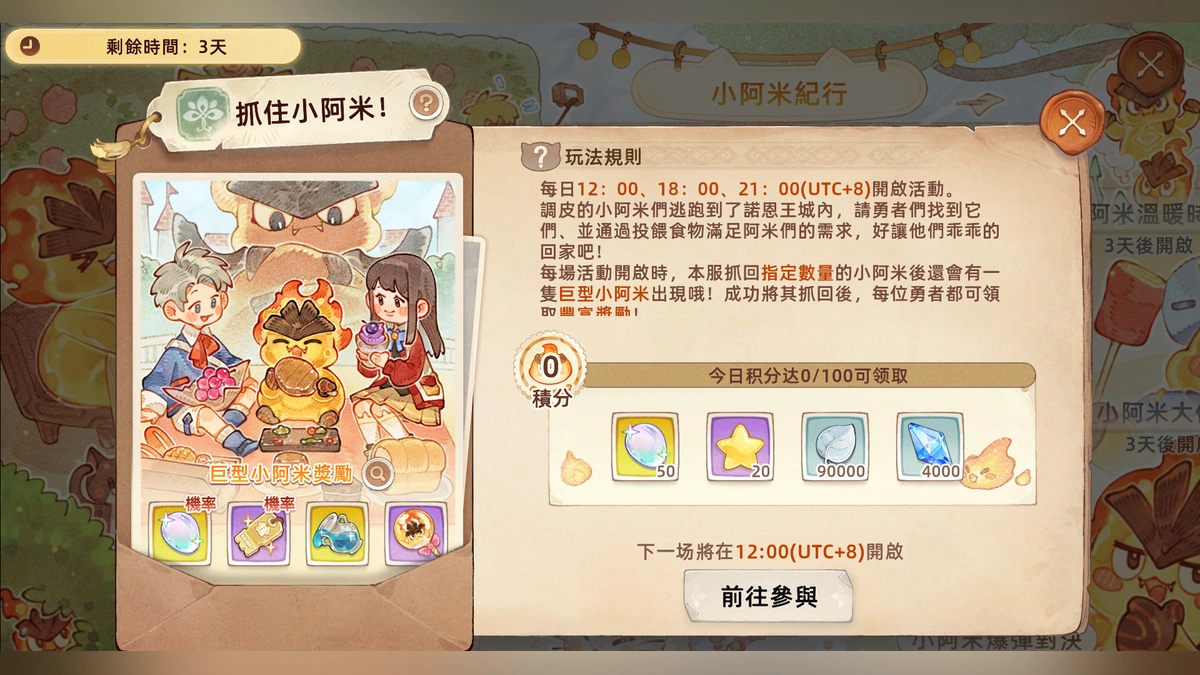 3月26日–4月5日期間,王城會在12:00、18:00、21:00(UTC+8)三個時間點更新小阿米,本服玩家可前往抓捕,共同抓捕數量達標後將會刷出巨型小阿米,透過抓捕巨型小阿米可領取包含時裝券、光珀、養成材料等獎勵的禮盒。