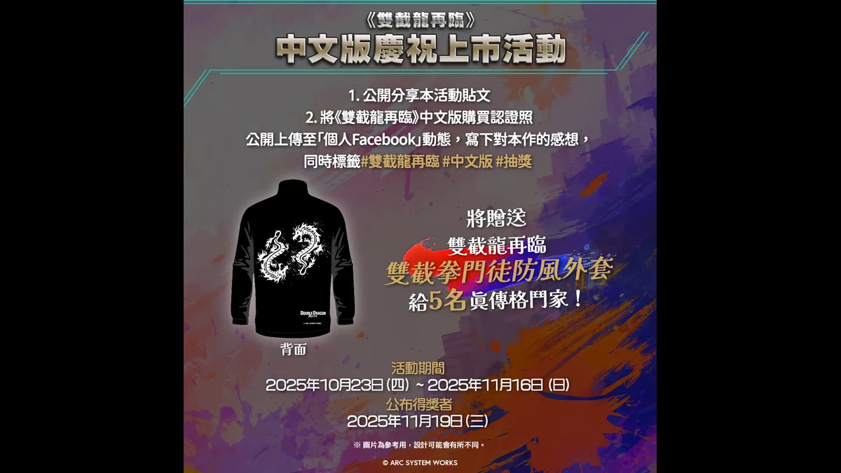 亞克系統亞洲(ARC SYSTEM WORKS ASIA)宣布,PlayStation®4、PlayStation®5、Nintendo Switch™、Xbox Series X|S、Xbox One、Steam®、Epic Games Store平臺的《雙截龍再臨》中文版於今日上市!並舉辦慶祝上市活動,參加活動就有機會得到「雙截龍再臨-雙截拳門徒防風外套」。