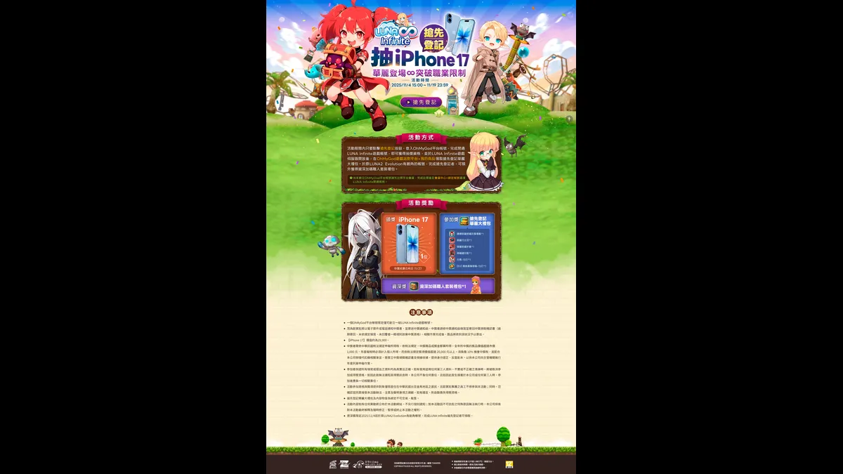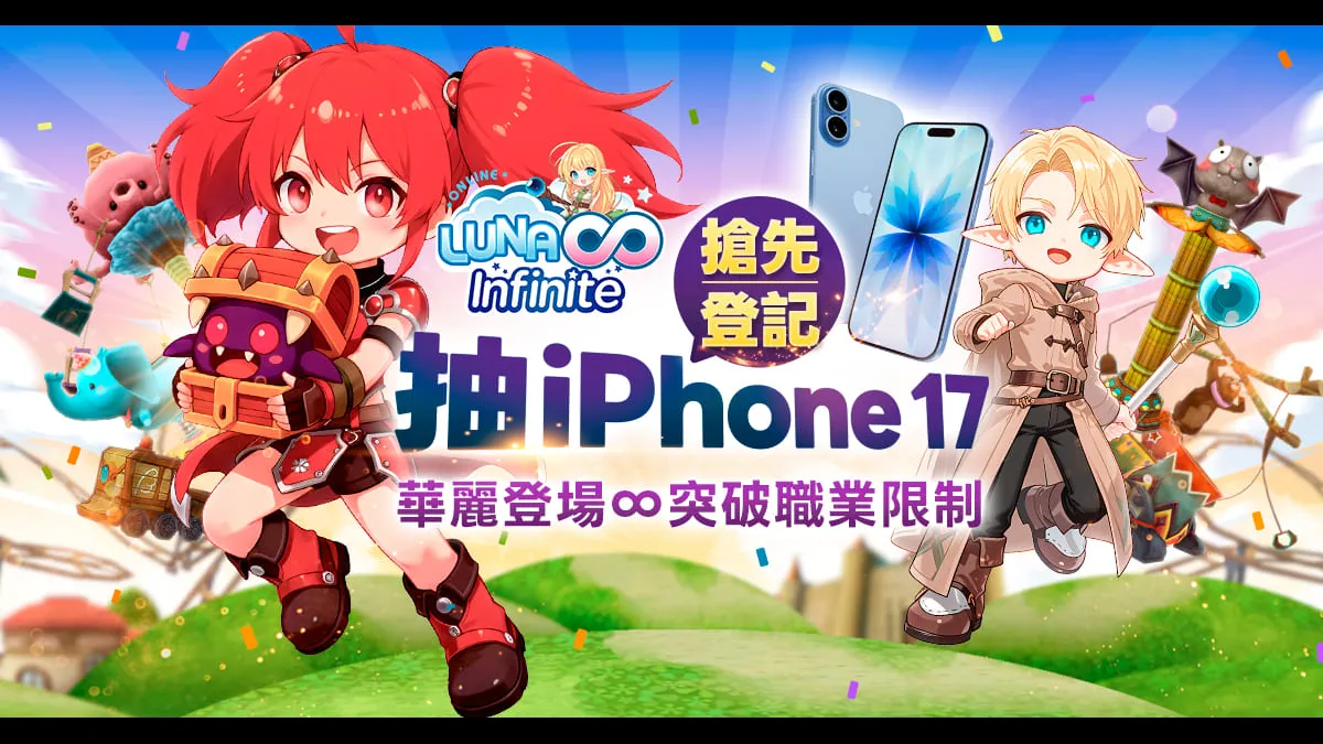 《LUNA Infinite》預登錄活動自11月4日(二)下午3點至11月16日(日)晚上11:59止。完成預約的玩家立即可獲得遊戲專屬虛寶大禮包,包含角色養成道具、鑽石等豐富獎勵。此外,官方更祭出超級大獎iPhone17抽獎,參與預約就有機會把最新旗艦手機帶回家!