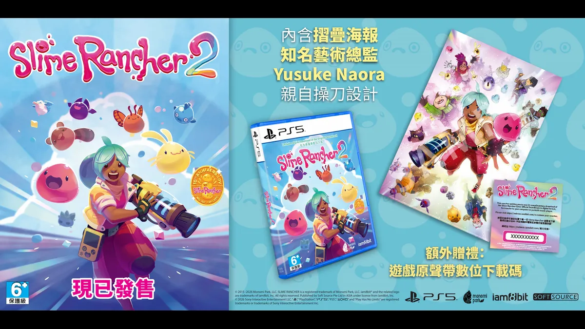 新加坡——2026 年 2 月 26 日 —— Soft Source Pte Ltd 與 iam8bit 及開發商 Monomi Park 攜手宣布,為紀念《史萊姆農場》系列十週年,《史萊姆農場 2》PlayStation 5 實體版 將於 2026 年 2 月 26 日正式在亞洲地區發售!這款極受歡迎的系列作此次推出的實體版本包含最新 1.0 版 「英雄的時光」,並特別印有紀念《史萊姆農場》系列十週年的 「Wiggly Forever」 紀念標誌。