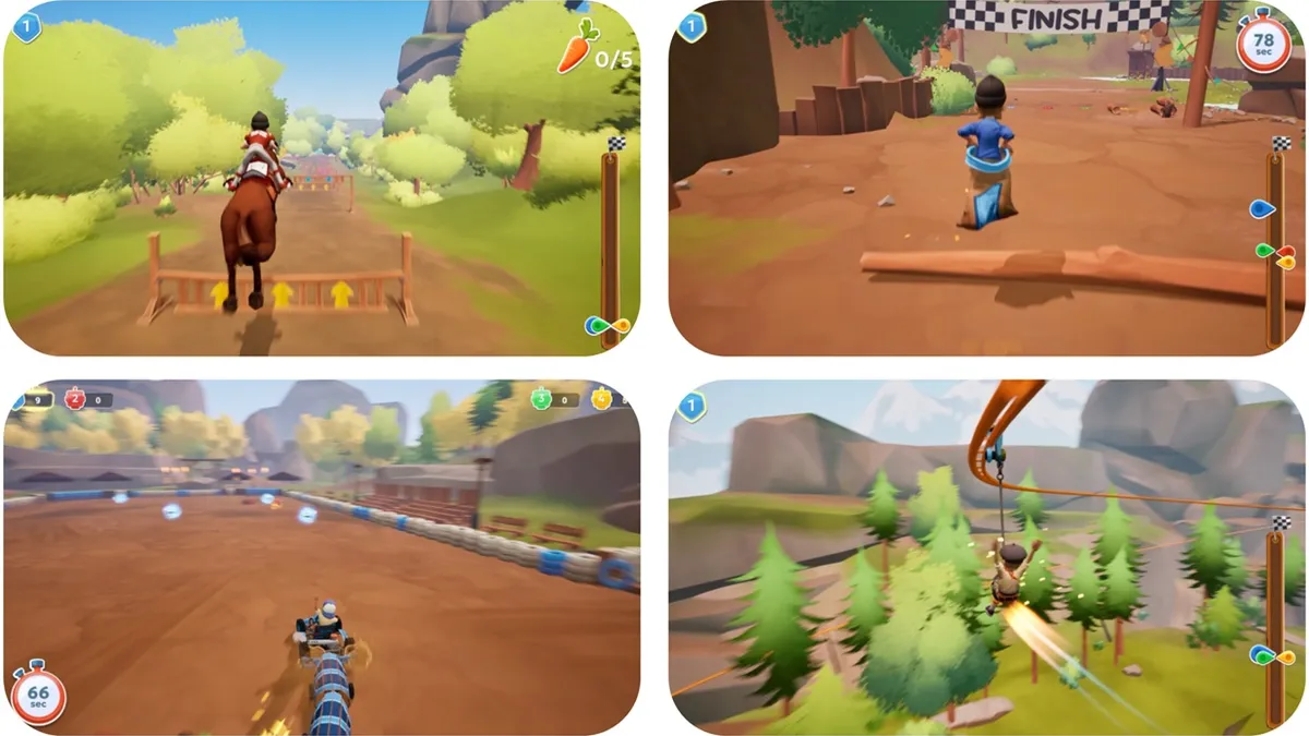 陸上活動:BMX極限單車、騎馬、滑索、卡丁車、攀岩、跳繩、射箭、飛盤、漆彈等等總共有35種以上的小遊戲!