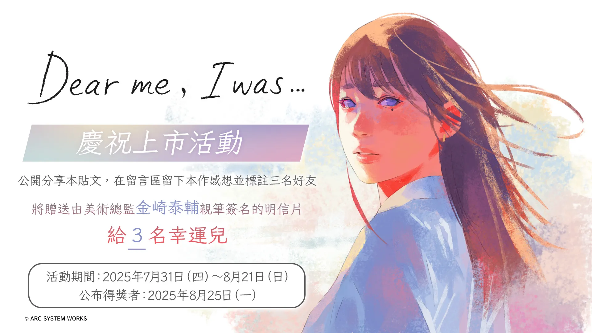亞克系統亞洲(ARC SYSTEM WORKS ASIA)宣布,Nintendo Switch™ 2專用軟體《Dear me, I was…》數位下載版於今日2025年7月31日(四)上市,並舉辦上市抽獎活動。