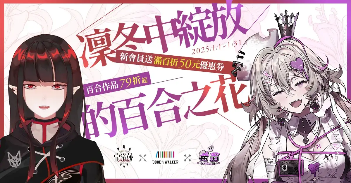 日本正版授權電子書平台BOOK☆WALKER與Limnos所屬一期生Vtuber「希翁」、個人勢Vtuber「亞洛赫」攜手推出「凜冬中綻放的百合之花」特別合作企劃,1月1日至1月31日活動期間內註冊的新會員可免費領取滿百折50元優惠券,而不限註冊時間、從未購書的讀者只要首購單筆訂單滿額350元,就能登記再領取100元購書金!這次更為了讀者們推出百合主題書展,參展作品限時79折起,「希翁」與「亞洛赫」也將在1月4日晚上9點進行Youtube直播,如果想了解主播們私藏了哪些精采百合好書,就千萬別錯過本次合作直播啦!