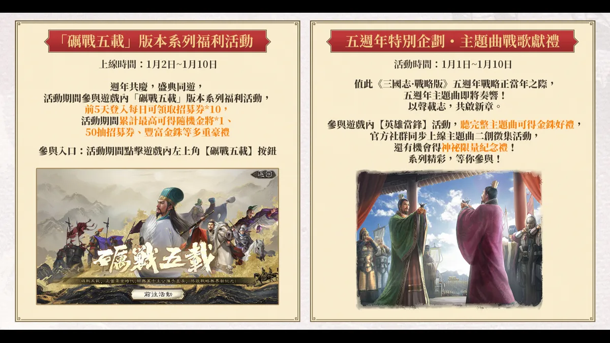 官方推出的「戰略・正當年」版本系列福利活動目前正在火熱進行中。其中,玩家參與「礪戰五載」 活動累計最高可獲得隨機金將、招募券和金銖等多重好禮,享受豐厚的福利獎勵。而從1月8日開始,遊戲內還將推出「記憶之卷」專屬活動。玩家可以進入遊戲查看個人專屬的五週年時光報告,與其他玩家共同回顧在《三國志・戰略版》中的熱血歲月,填寫五週年祝福寄語並發送彈幕留言,還可獲得金銖好禮。
