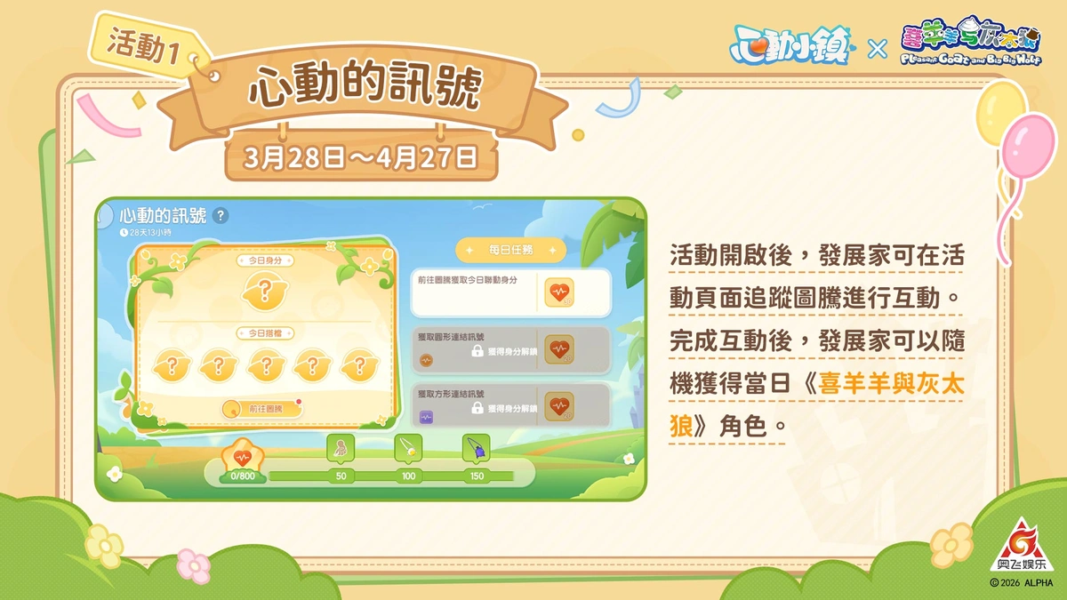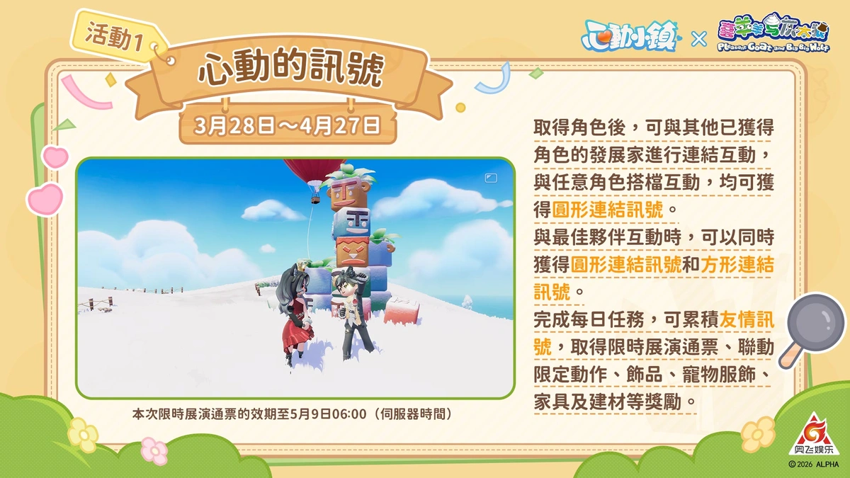 在小鎮找到你的最佳夥伴吧!聯動期間神秘圖騰將於小鎮登場!發展家每日前往圖騰處進行互動,即可隨機獲得「喜羊羊」、「美羊羊」、「懶羊羊」、「灰太狼」或「紅太狼」的專屬角色身份,透過與不同身份的發展家進行連結互動,累計「友情訊號」,就能兌換大量聯動限定獎勵。精緻的建材「羊村大門」到溫馨的家具「狼堡小窩」,甚至是超萌的「瀟灑哥/黑大帥/蛋蛋」三系列挎包、寵物服裝,以及經典動作「畫個圈圈詛咒你」,通通等著你帶回家收藏!除此之外,活動期間與好友進行每日面對面雙人互動,達成指定天數即可解鎖專屬雙人動作「奇想共鳴」、「情意綿綿」以及超熱血的「雙人戰隊!合體!」,快來看看誰才是你最默契的同頻夥伴!