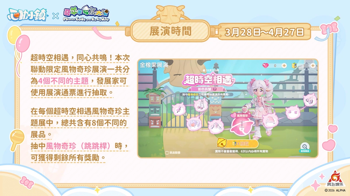 除了精彩的活動,明(28)日也將開啟「金橡果展演:超時空相遇主題盛典」,發展家們將能穿上「超時空相遇·藍色訊號」、「超時空相遇·粉色訊號」、「超時空相遇·紅色訊號」、「超時空相遇·灰色訊號」四款角色主題時裝,並獲得「跳跳桿」載具,在青青草原上高調彈跳。不僅如此,收集不同款式的跳跳桿除了能獲得「展演通票」與「平底鍋玩具」,只要集齊四款特色載具,還能免費解鎖終極夢幻座駕「紫氣蛋來」。無論您是追求草原時尚的時裝獵人,還是想要騎上載具彈跳著去拜訪親朋好友,都絕對不要錯過這場超時空盛會!