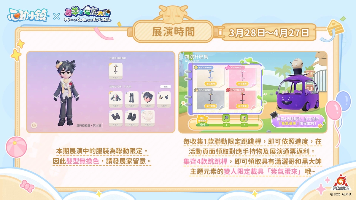 聽見來自青青草原的呼喚了嗎?《心動小鎮》將於明(28)日與經典動畫《喜羊羊與灰太狼》正式展開聯動,主題活動將為發展家們帶來全新的互動玩法、專屬雙人動作,以及充滿童話感的聯動系列時裝與載具。無論你是想當聰明的喜羊羊,還是迷人的反派角色灰太狼,都能在小鎮寫下你的專屬故事!