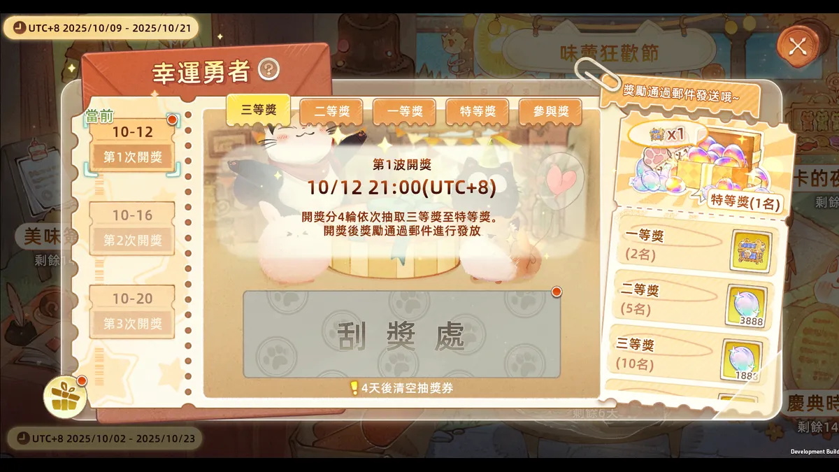 10月2日-10月22日,勇者可領取多重週年好禮。每日登入即可領取喵喵大表情、光珀、砸蛋幣等豐厚獎勵;通過週年戰令簽到,還能免費獲得「燦爛慶典」時裝三件套,此外開啟女武神賽季的區服可以免費領取新賽季金寶物自選;未開啟女武神賽季的區服可以免費在金色幻果「度瑪」和「深海巨靈」中任選其一。特別推出的三輪【幸運勇者】抽獎活動,更讓每位勇者都有機會贏得18888彩珀和紅色時裝坐騎等豪華大獎,此外,全新上線的週年紀念冊將為勇者呈現這一年的冒險歷程,分享回憶更可獲得限定稱號和珍貴道具。