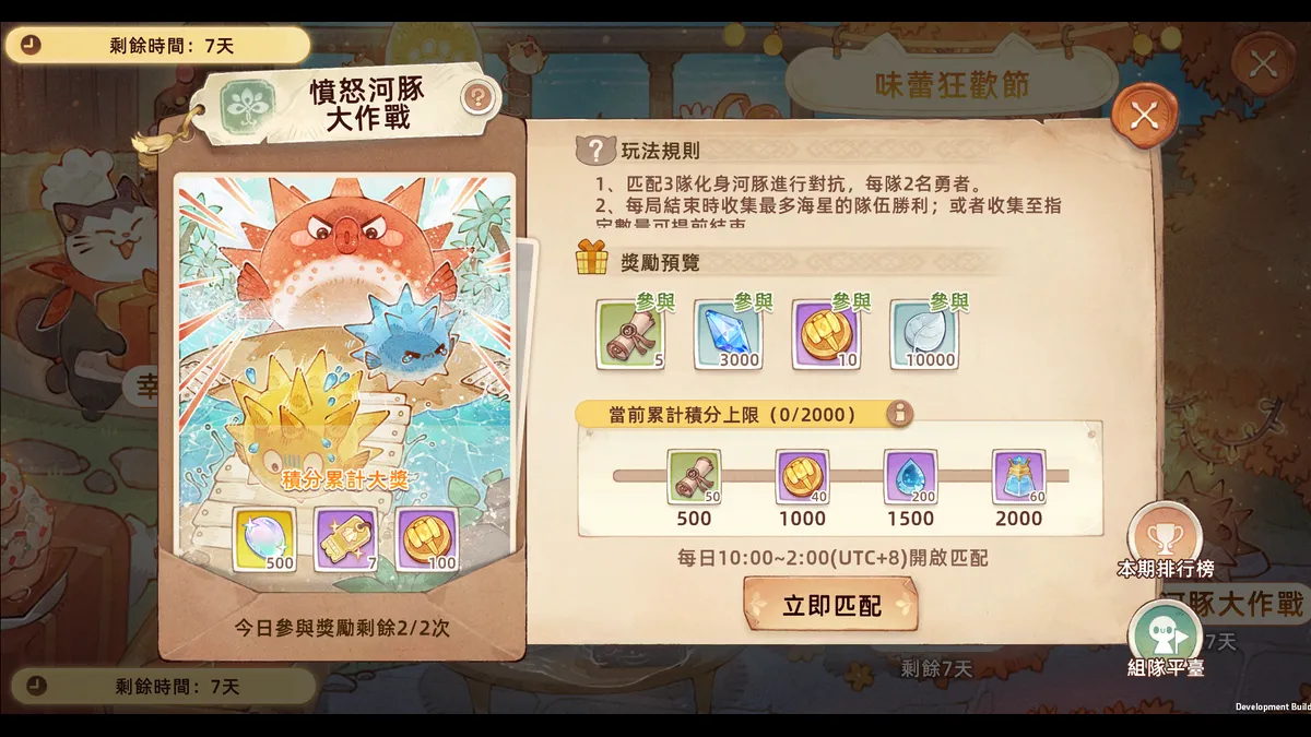 【憤怒河豚大作戰】讓勇者化身河豚,在三個隊伍中展開2V2V2的對抗,並體驗收集海星的樂趣,獲勝隊伍可領取限時聊天框、限時稱號、記憶結晶、時裝扭蛋券等獎勵。