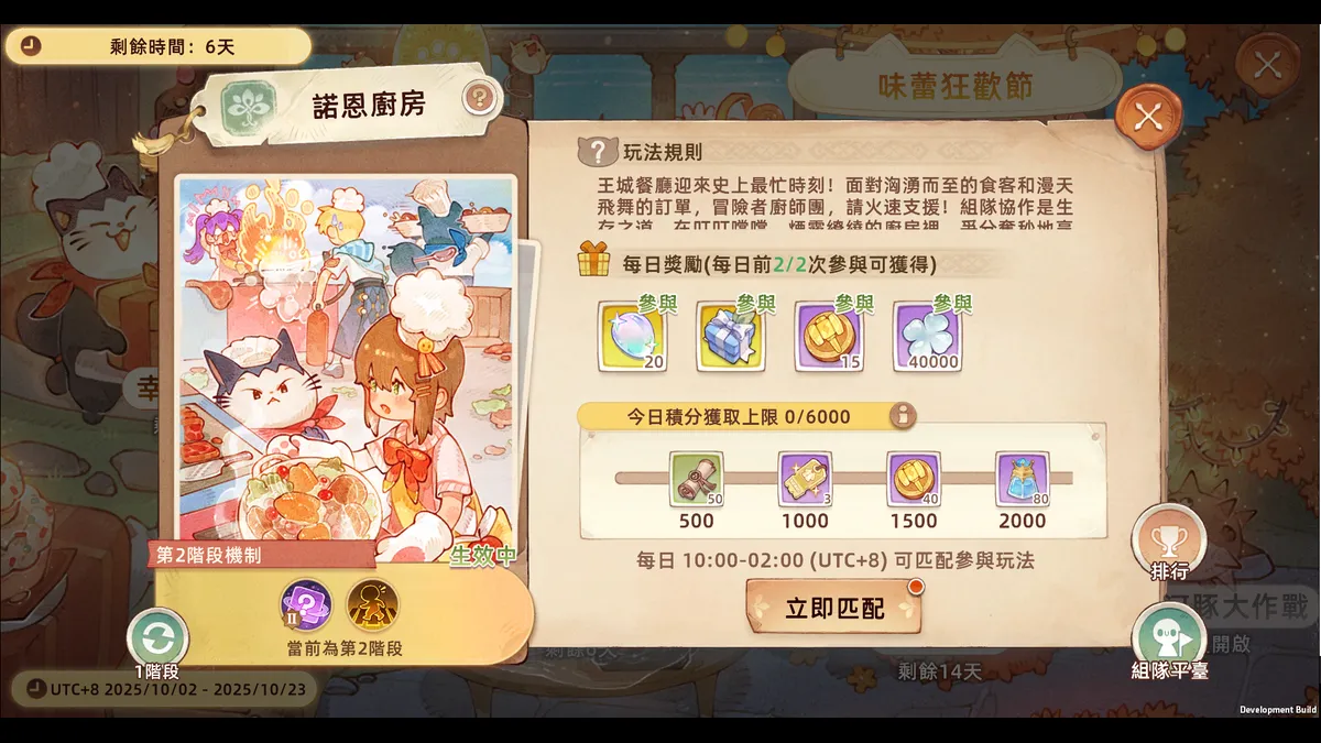 【諾恩廚房】則需要勇者組隊合作,根據條件要求對食材進行加工烹飪,在規定時間內提交餐點獲得積分,積分較高的一方可以獲得喵喵大表情、扭蛋幣、女神碎金等勝利獎勵。