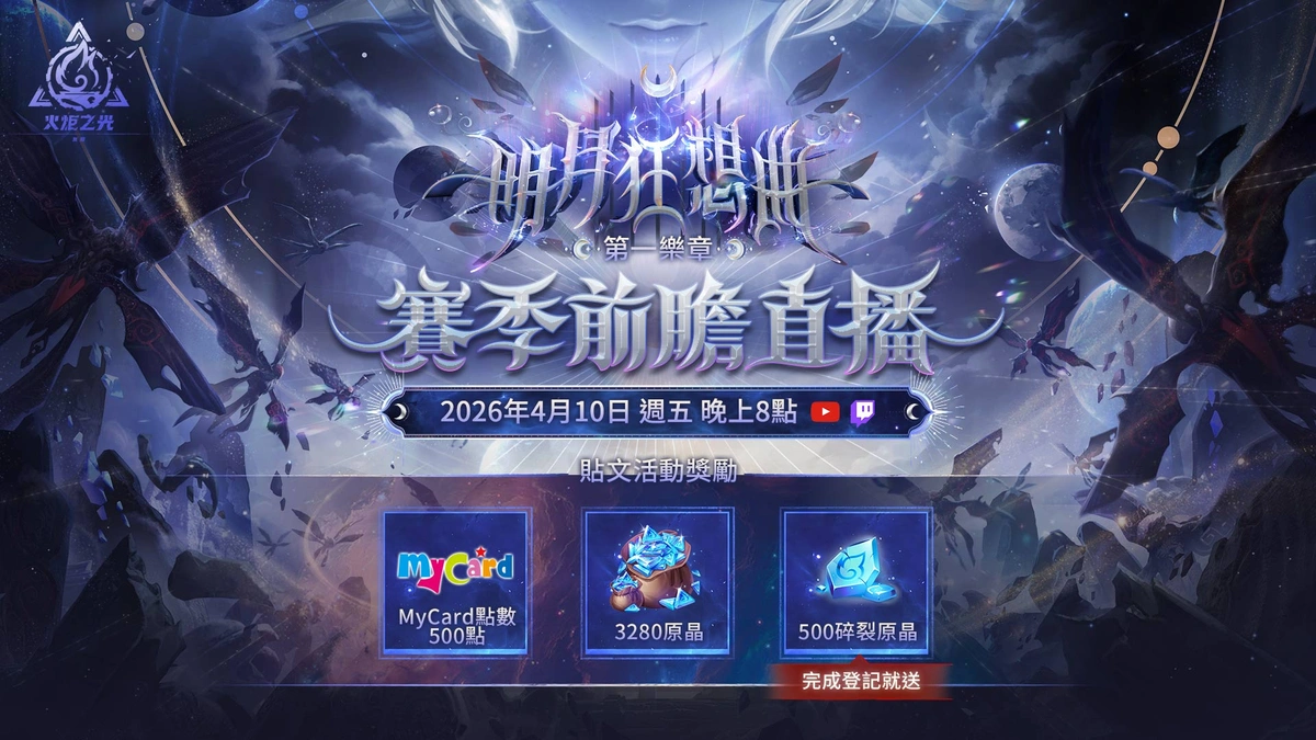 隨著前瞻發佈會即將到來,官方將展開一系列社群暖身活動,邀請獵人們參與互動並關注新賽季情報釋出。參與活動即有機會獲得MyCard3290點、6480原晶、火炬之光RGB滑鼠墊、火炬漢比公仔等多項獎勵,活動詳情將陸續於官方社群公開,一同迎接【明月狂想曲】的到來。