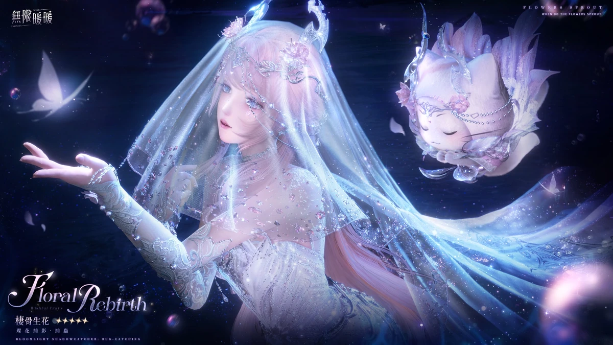 五星套裝「棲骨生花」:屬性清新, 具有【璨花捕影·捕蟲】能力。配置後可進行大範圍極速捕蟲,使採集過程更為流暢。共鳴達160次可領取「深海瑩輝禮盒」,解鎖在大世界翩翩起舞的專屬舞蹈與動作。套裝支援多部件款型切換,三階進化後可獲得妝容「凋零之嘆」及進化特效。