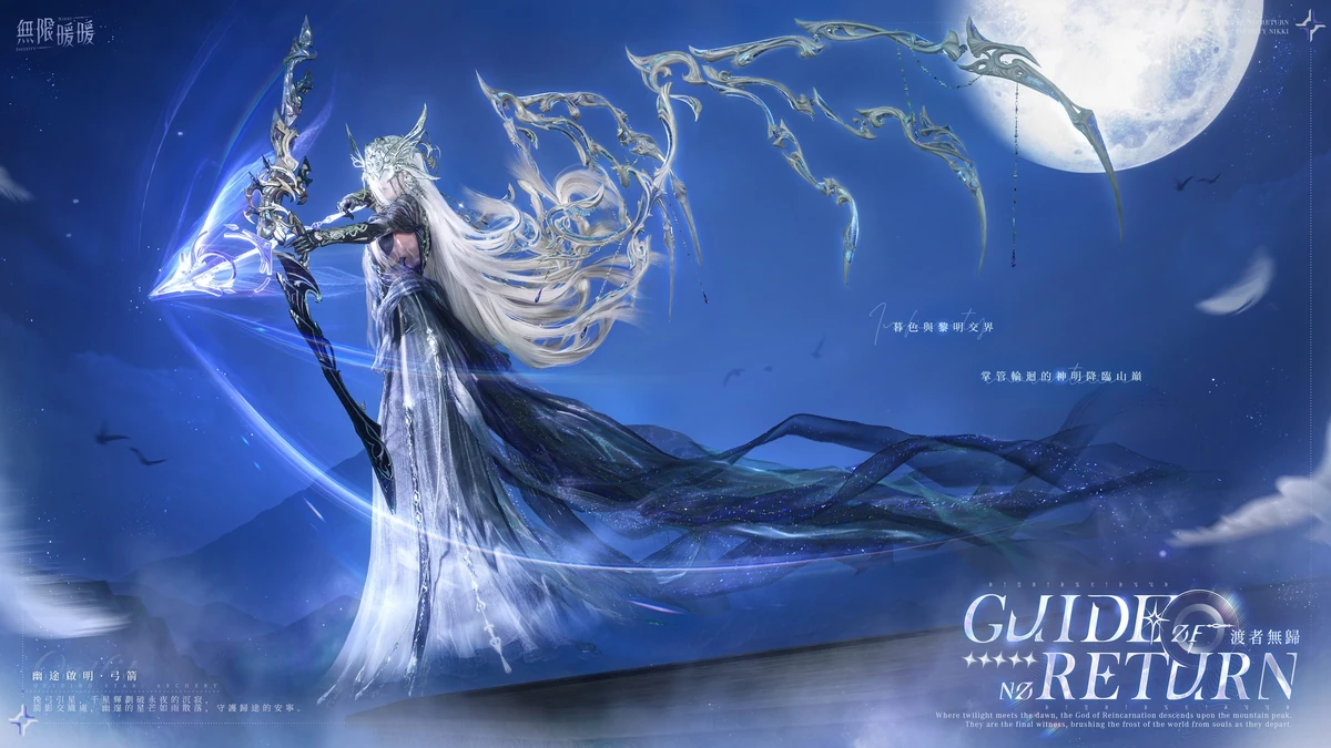 五星套裝「渡者無歸」:屬性性感, 獲得後可解鎖強力戰鬥能力【幽途啟明·弓箭】。暖暖可使用弓箭遠程精準打擊,並透過「萬靈守望」狀態進入空中戰鬥模式,施放高頻率的終結一擊。搭配的大喵斗篷「魂詠」亦支援遠程貫穿攻擊,並能為暖暖回復心誓與能量。共鳴達160次可獲得大型螺旋擺飾「萬靈徊旋」。