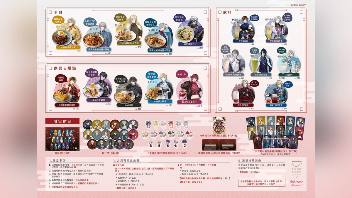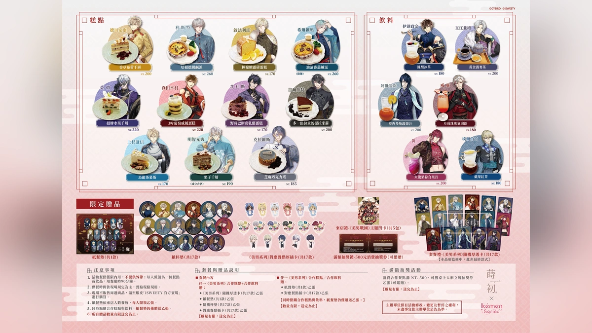 凡來店內用合作套餐(包含主餐、副餐或甜點)與合作飲料各乙份,即可獲得《美男系列》隨機厚透卡乙張(共17款)。