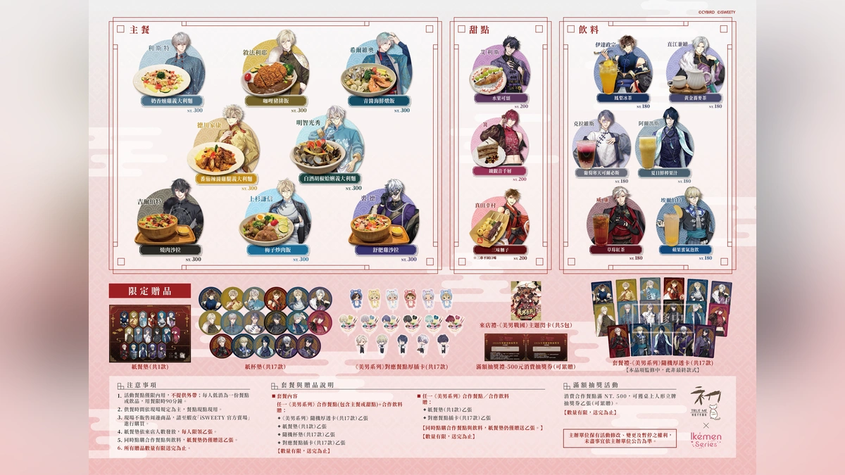 凡來店內用合作餐點不限金額,即可獲得《美男戰國》主題閃卡乙份(內含5包)。