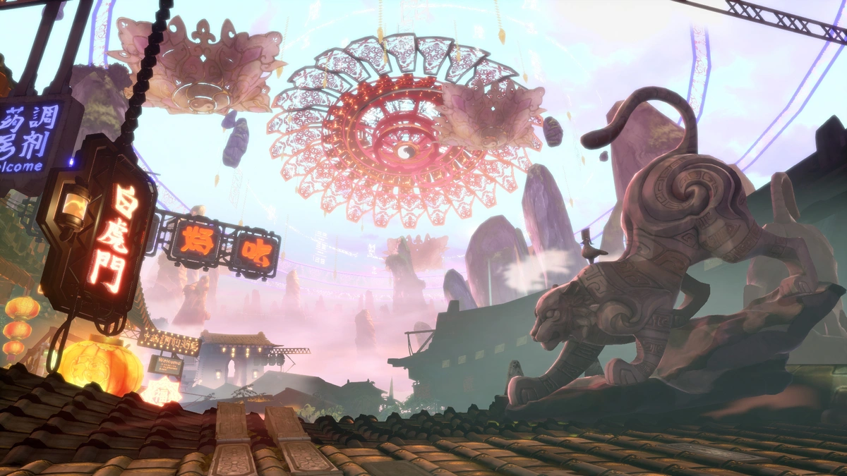 新增戰鬥舞臺 「Cradled by the Four Beasts」描繪了一座受到四聖獸守護的村落。村民運用法力調節天氣與日照,在充沛的水源與資源環境中過著富足安定的生活。