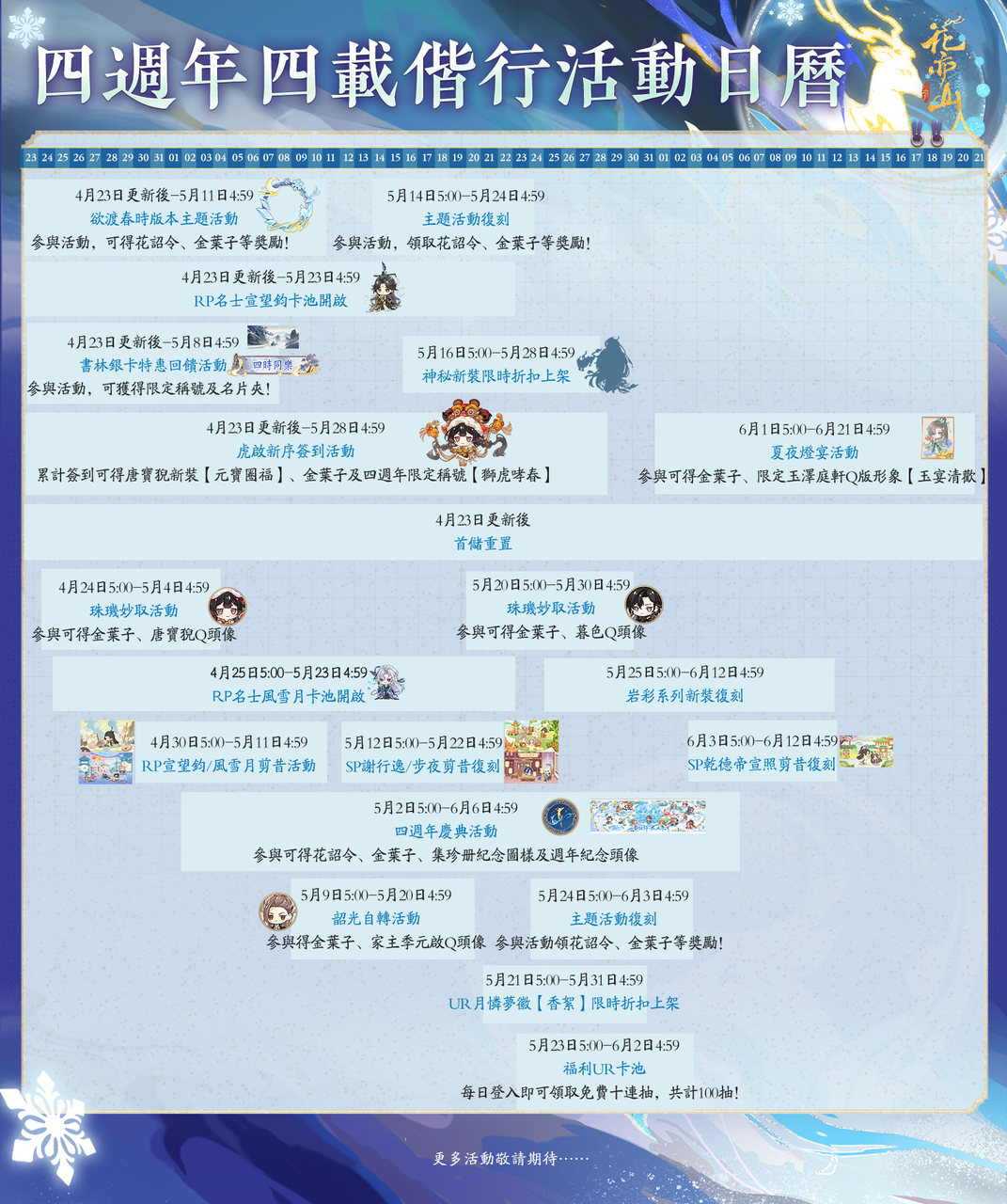 時光荏苒,情誼如初,從初入明雍書院的懵懂,到如今在繁華盛景中並肩前行,《花亦山心之月》即將迎來值得紀念的四週年里程碑。為慶祝此一重要時刻,年度大型主題活動「欲渡春時」於 4 月 23 日更新後盛大開啟,一系列精彩紛呈的週年慶典與總價值超過 70 抽的豐厚福利同步登場,更將獻上「UR 卡池免費 100 抽」重磅好禮,誠摯邀請各位學子重返書院,共赴這場四年一度的浪漫之約。