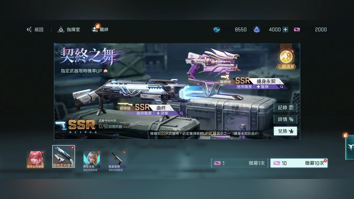 活動說明:活動期間,前往「黑盾徵募- 限時定向軍備」,搜尋到SSR武器時,必定獲得「曲終」、「纏身永契」兩把UP武器其中之一。