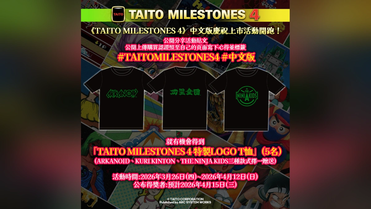 為慶祝《TAITO MILESTONES 4》中文版上市,從今天起舉辦抽獎活動。公開上傳中文實體盒裝版購買認證照或是遊玩遊戲的畫面並留下關於本作的感想,就有機會得到由ARKANOID、KURI KINTON、THE NINJA KIDS三種遊戲主題設計而成的「TAITO MILESTONES 4特製LOGO T恤」其中一款。