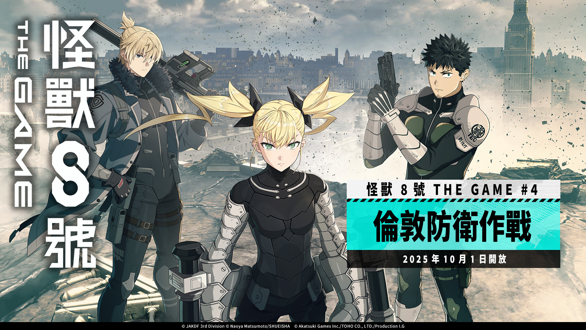・企劃・製作:Akatsuki Games Inc.、TOHO CO., LTD.、Production I.G ・開發・營運:Akatsuki Games Inc. ・宣傳協助:TOHO CO., LTD.、Production I.G ・發行:Akatsuki Games Inc. ・發行平台:App Store、Google Play 商店、Steam® ・支援語言:日文・英文・繁體中文・簡體中文・韓文・法文 ・價格:基本遊玩免費(道具付費制) ・版權標記: © JAKDF 3rd Division © Naoya Matsumoto/SHUEISHA © Akatsuki Games Inc./TOHO CO., LTD./Production I.G ・遊戲官方網站:https://kj8-thegame.com/ ・遊戲官方 X 帳號(英文):https://x.com/kj8_TheGame_EN ・遊戲官方 YouTube 頻道(英文):https://www.youtube.com/@kj8-TheGame-EN ・App Store https://apps.apple.com/tw/app/kaiju-no-8-the-game/id6742088839 ・Google Play 商店 https://play.google.com/store/apps/details?id=jp.aktsk.games.kaiju_no8_the_game |