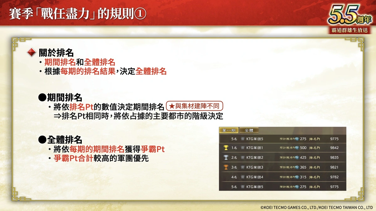 排名以軍團為單位,分為「期間排名」與「全體排名」兩種類型。「期間排名」依占據或奪取主要都市所獲得的排名Pt決定。「全體排名」則是依每期的排名所獲得的爭霸Pt總和來決定。另外,在本次的賽季中,無法同時占據A級以上的主要都市與B級以下的主要都市。