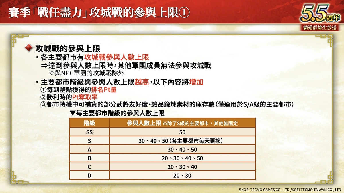 各主要都市的攻城戰皆設有參與人數上限,並以影響攻城戰期間的傷害等數值的「戰任」為主要特色。主要都市設定了20人、30人、40人、50人的參與人數上限,無論是攻擊方或防衛方,都無法超過該人數參與攻城戰。此外,玩家也可以脫離攻城戰,並透過替換參與的軍團成員來進行作戰。