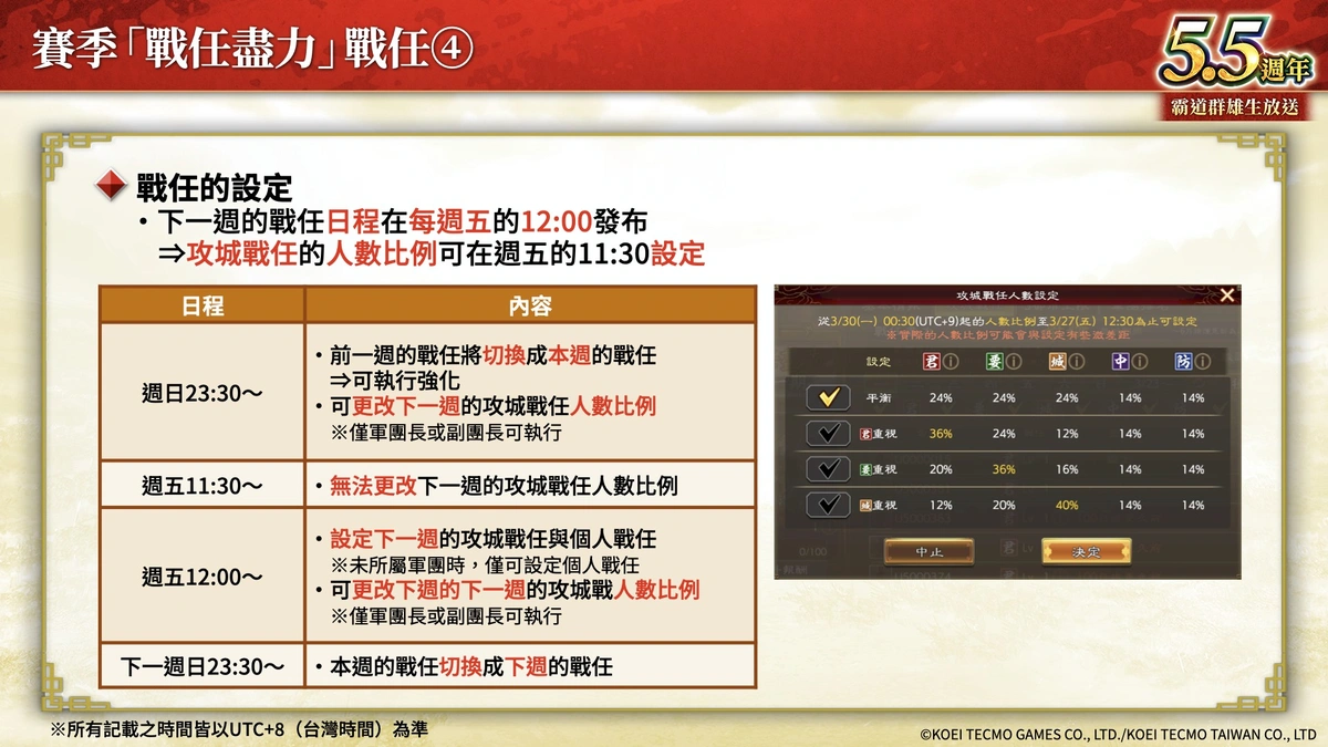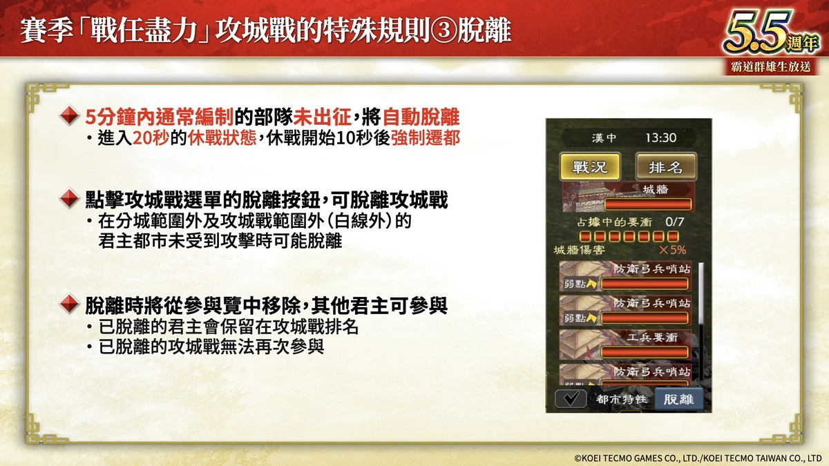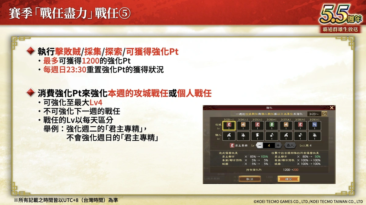 「個人戰任」則會帶來一些較為低調但實用的加成效果,例如縮短募兵與治療所需的時間,或在修練獲勝時有一定機率提高可獲得的報酬等。戰任會每日進行設定,玩家可依不同日期體驗不同的攻城戰任,享受多樣化的攻城戰玩法。此外,還可透過擊敗賊、採集與探索所獲得的強化Pt來強化戰任。