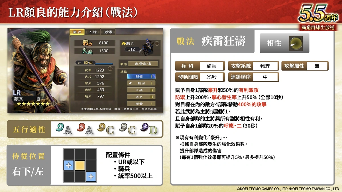 「LR顏良」為騎兵武將,能透過「豪升」、「有利激攻」以及擊心,於戰法攻擊時對敵人造成大量傷害。此外,對敵方部隊的戰法具備高耐久力,能有效抑制戰法強力的武將所造成的傷害。
