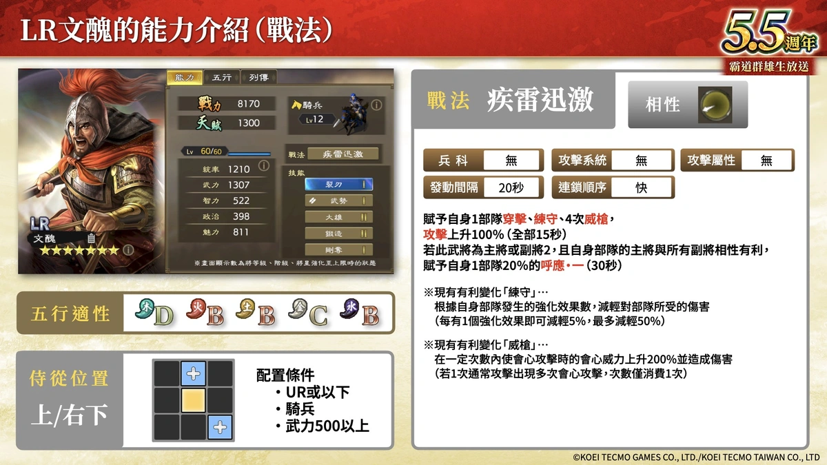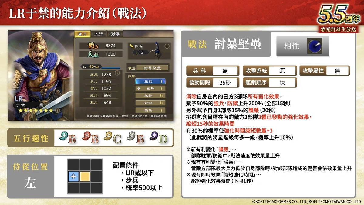 「LR于禁」為步兵武將,透過新有利變化「護嚴」,可在駐軍/防衛中快速發動戰法。此外,還能大幅降低來自兵科相性有利的敵人造成的通常攻擊傷害,面對通常攻擊強大的部隊時,能穩定應戰。