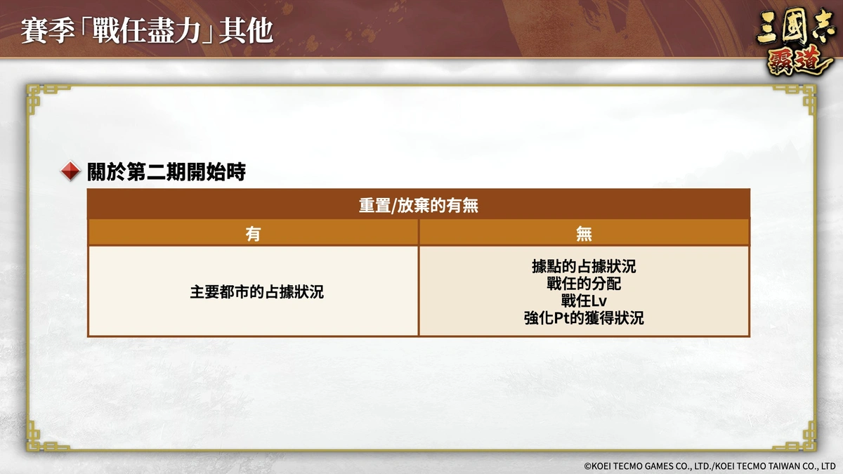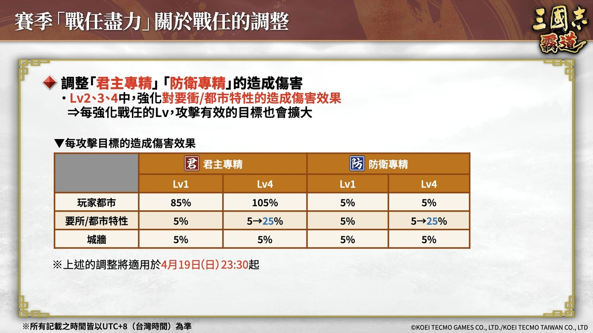即日起,賽季「戰任盡力」第二期開戰。透過點將功能可設定攻城戰開始時自動參與,這將使參加攻城戰變得比以往更加方便。在「攻城戰任」中,針對君主專精及防衛專精Lv2/3/4,強化對要衝/都市特性造成的傷害量。透過增加攻城戰中的行動選擇,讓攻城戰的時間運用更有效率。同時參考第一期攻城戰的數據,增加S/A/B級主要都市中,參與人數上限較高的都市比例。