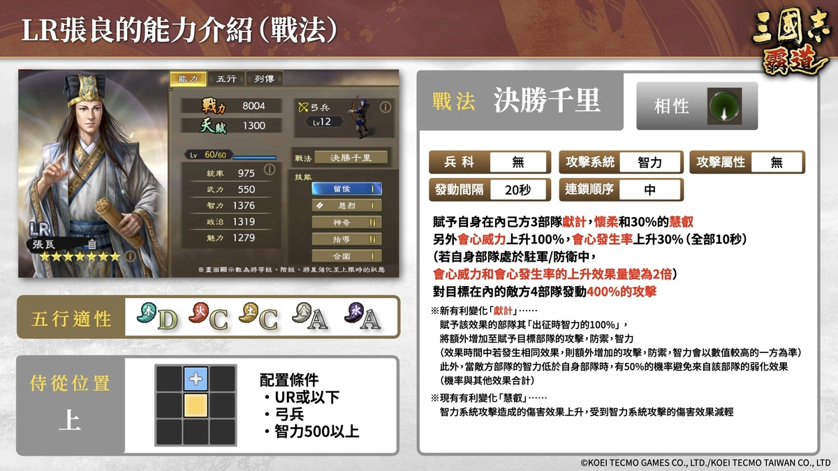 「LR張良」則為弓兵武將,能透過新有利變化「獻計」發揮強大支援能力。他能根據自身部隊的智力來提升我方部隊的攻擊、防禦與智力,並有50%的機率可迴避智力較低之敵方部隊所賦予的弱化效果。透過賦予「壓抑騎兵戰法」及大幅強化會心性能,自身也能發揮優異的對部隊能力。