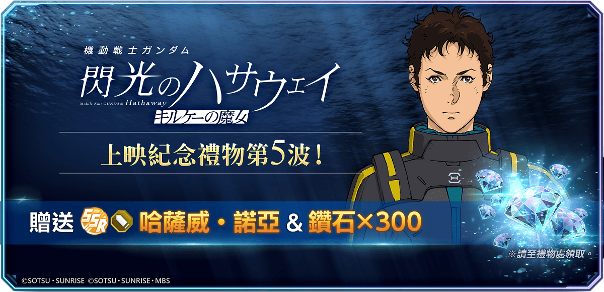 《機動戰士鋼彈 閃光的哈薩威 喀耳刻的魔女》上映紀念禮物第5波登場!現正推出特別活動,玩家將可獲得SSR角色「哈薩威‧諾亞」及鑽石300個!第1波至第4波贈禮仍持續發送中,尚未領取的玩家請務必至遊戲內的「禮物」處領取!